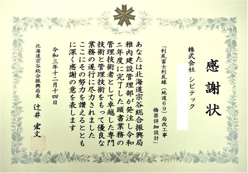 このたび、稚内建設管理部の「令和3年度優秀管理技術者表彰」において、卓越した専門技術と管理技術をもって優れた成果を収めたとし、当社が担当した業務が見事受賞に輝きました。