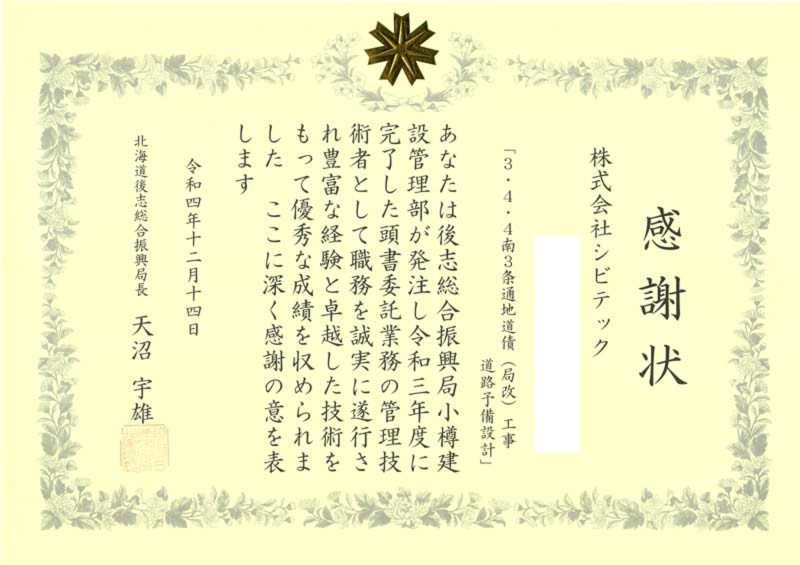 このたび、小樽建設管理部の「令和4年度優秀管理技術者表彰」において、特に優秀と評価され、当社が担当した業務が見事受賞に輝きました。