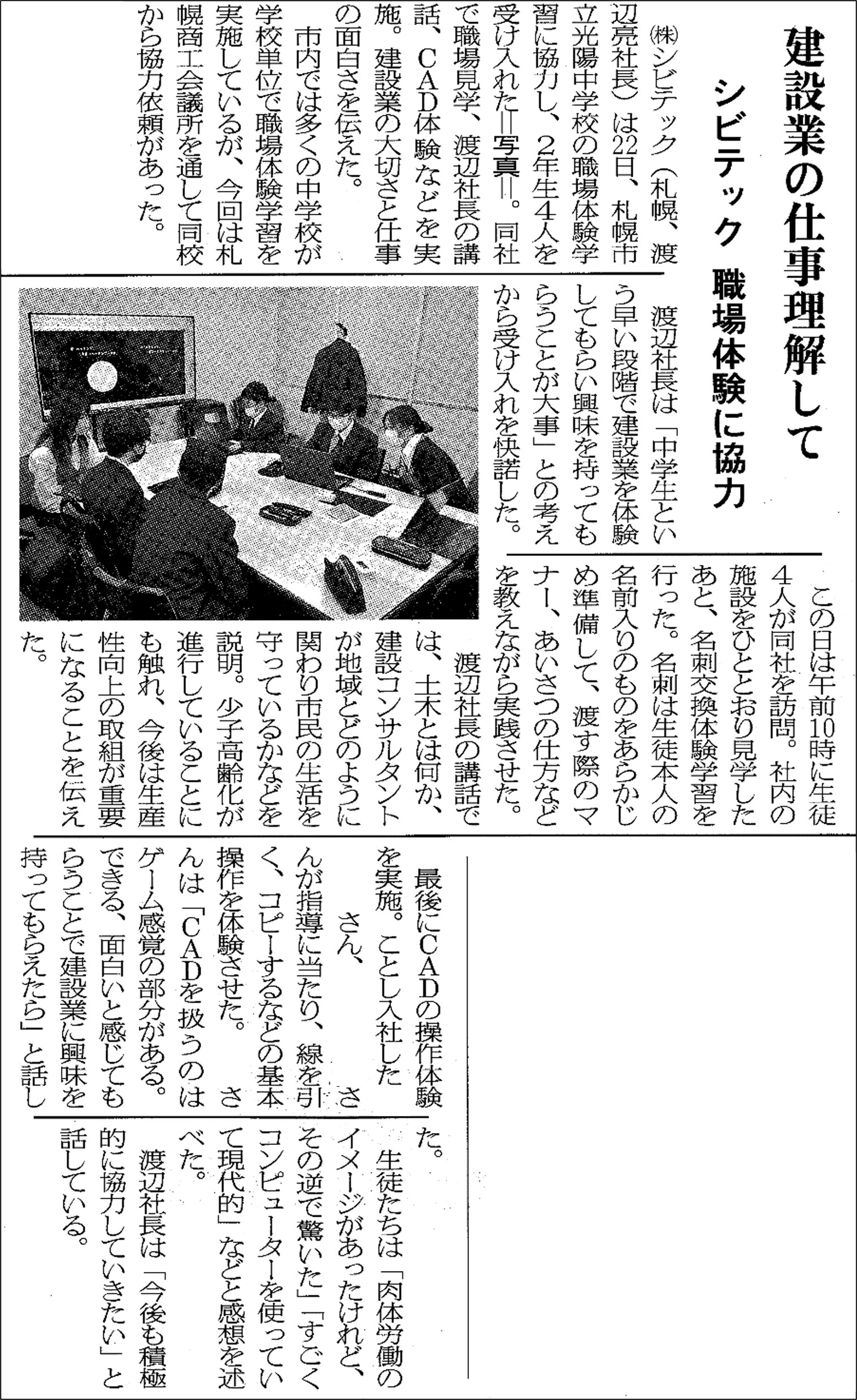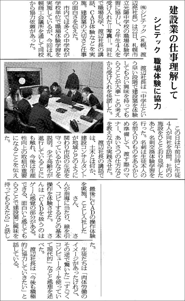 2023.11.27 / 最終更新日時 : 2025.10.21 admin お知らせ 「北海道通信」にて中学生 職場体験受け入れの紹介 このたび、業界紙「北海道通信 日刊建設版」(11月27日発行)にて、札幌市立光陽中学校の職場体験学習に協力し、2年生4名を受け入れたことが紹介されました。 北海道通信 日刊建設版(2023年11月27日発行) *画像をクリックすると拡大します。