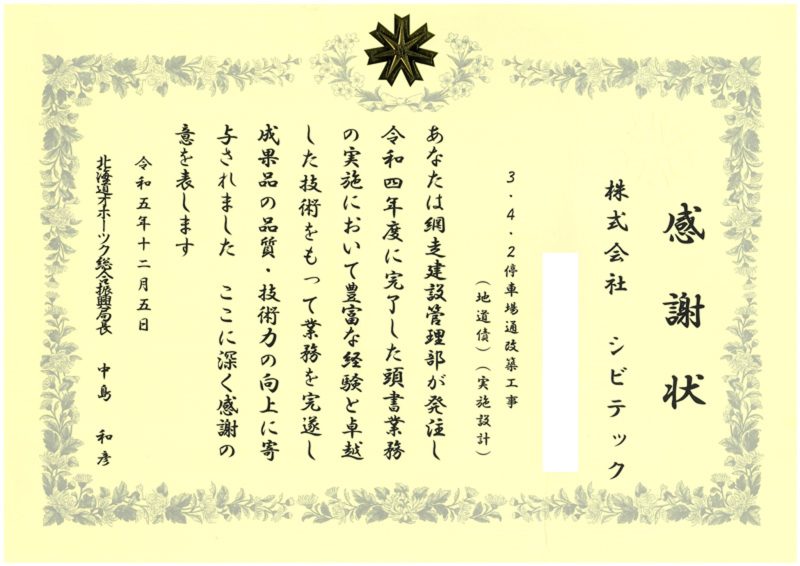 このたび、網走建設管理部の「令和5年度優秀現場代理人等表彰」において、特に優秀と評価され、当社が担当した業務が見事受賞に輝きました。
