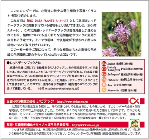 これまでの本カレンダーは「RED DATA PLANTSシリーズ」として、北海道レッドデータブックに掲載されている植物、今後指定が予想される希少な植物をとりあげてきました(2004年スタート)。