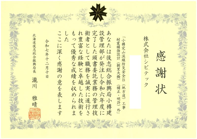 このたび、小樽建設管理部の「令和7年度優秀管理技術者表彰」において、特に優秀と評価され、当社が担当した業務が見事受賞に輝きました。
