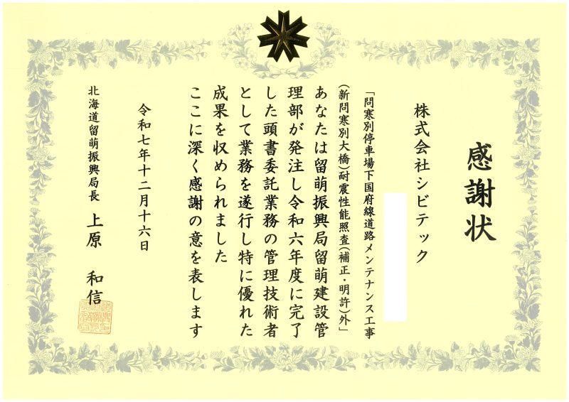 このたび、留萌建設管理部の「令和7年度優秀管理技術者表彰」において、特に優秀と評価され、当社が担当した業務が見事受賞に輝きました。